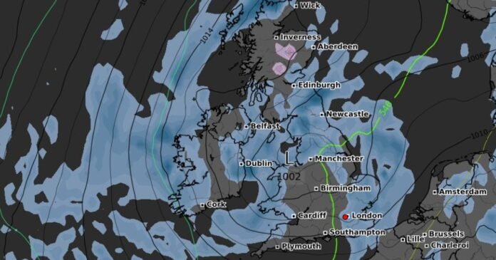 Britons are bracing for a drop in temperatures, which could lead to snowfall this upcoming weekend as indicated by weather maps. Following a warm and dry summer, the start of September has been characterized by unsettled weather patterns, a trend expected to persist in the coming weeks. Stormy conditions over the weekend and into Monday brought heavy rain and gusts of up to 74mph in the Isle of Wight, with more blustery weather anticipated as low-pressure systems move in from the Atlantic.