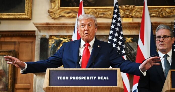Subsequently, around 60 reporters from the US and UK were ushered into a grand chamber adorned with oil paintings. Trump’s administration officials mingled among the press, causing some confusion by applauding at the start and end of the event, a practice uncommon among the UK press corps.