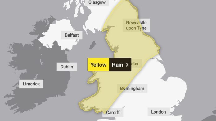 A yellow weather warning has been issued by the Met Office, spanning from Scotland down to the Midlands and Wales. The warning, in effect from 9 am today until 6 am on Sunday, highlights the risks of flooding, road spray, and widespread disruptions to road and rail travel due to stormy conditions.